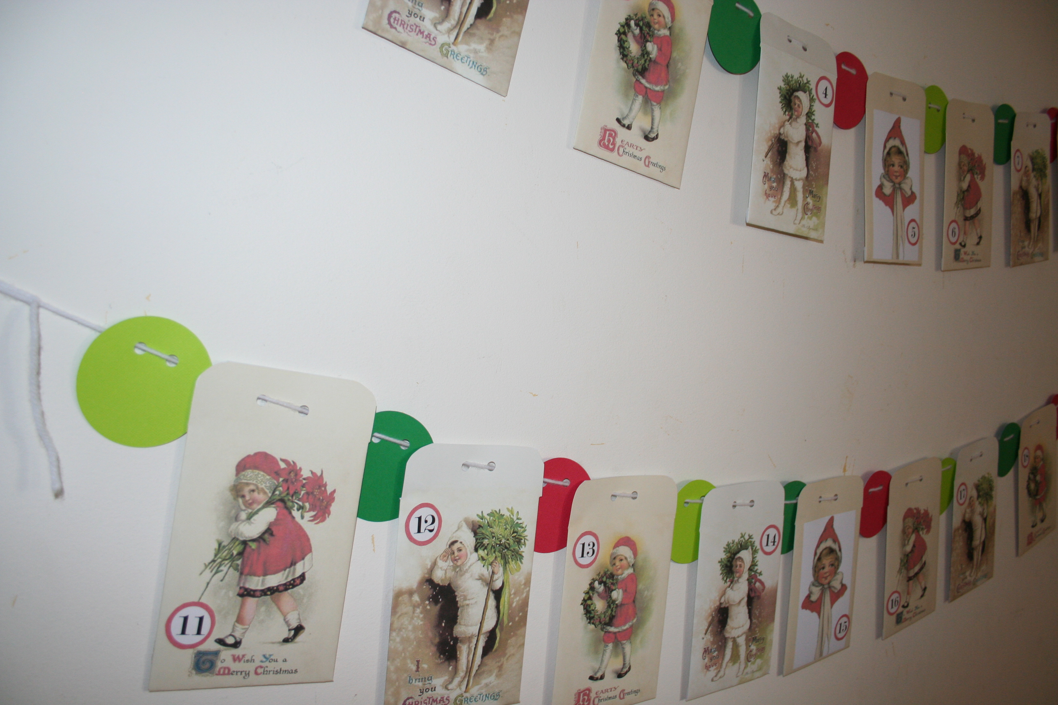 I printed them out on white cardstock. Then I cut each one out, folded and taped them. I left the top flap straight. I punched two holes into the top and then threaded each envelope onto some white yarn.