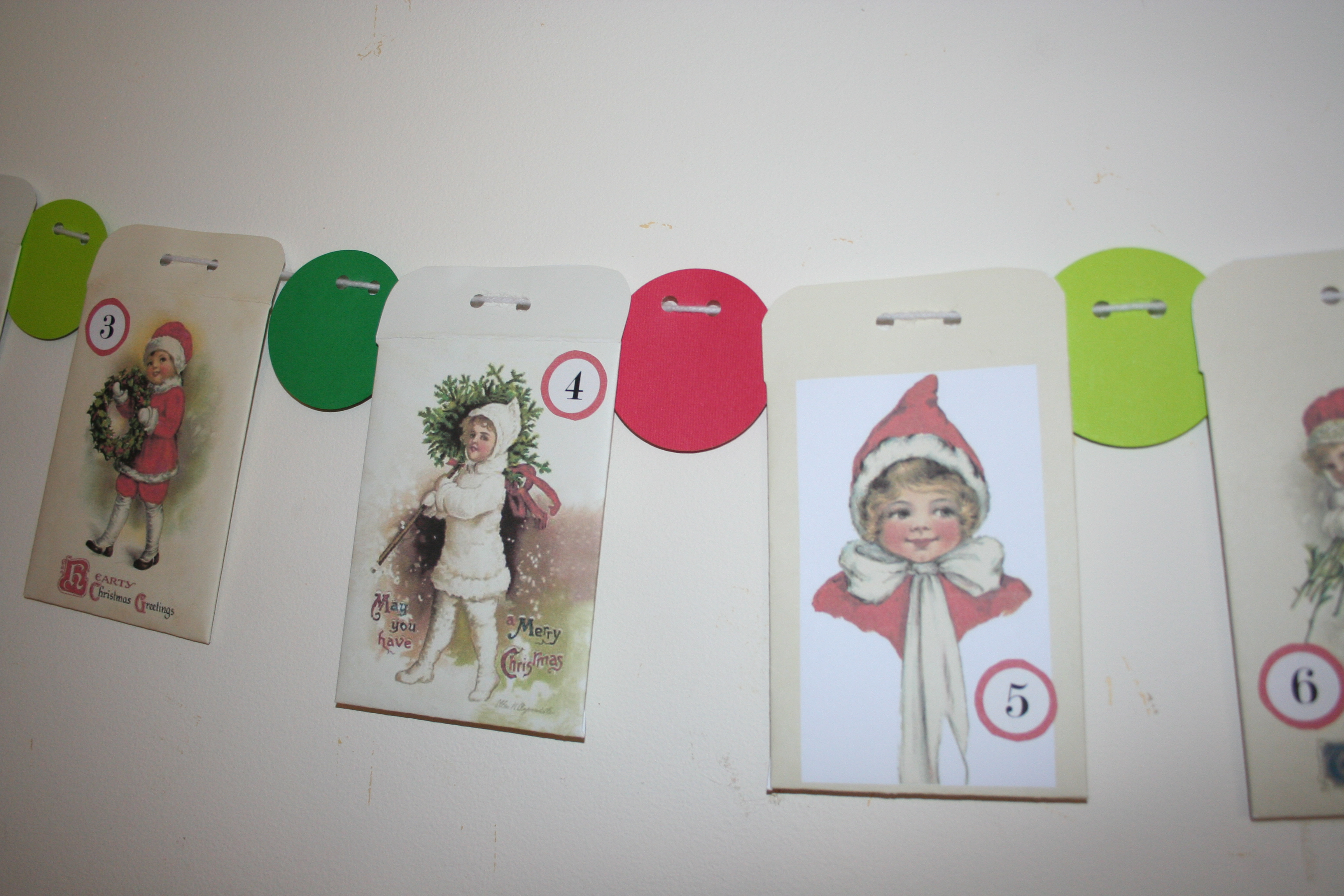 I found these envelopes at Go Make Something. There were only four, and I needed five, so I used this image from The Graphics Fairy to make a fifth envelope. For the numbers, I used the circles from this advent kit by Just Something I Made.