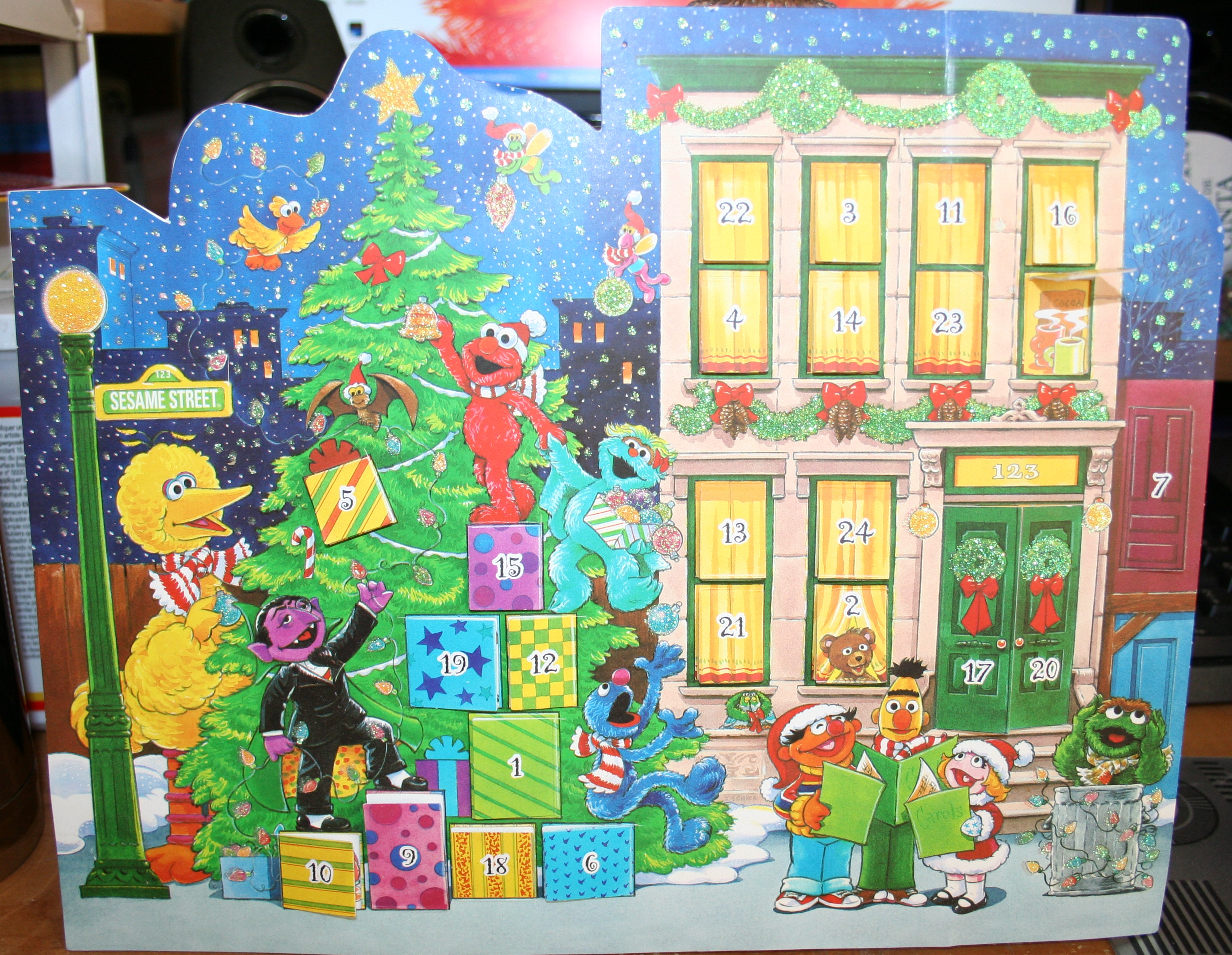 When I got married, I wanted to find another special calendar, but this time, it did not have to involve chocolate. We found one featuring the characters from Sesame Street. For thirteen years, we have put up this particular calendar.