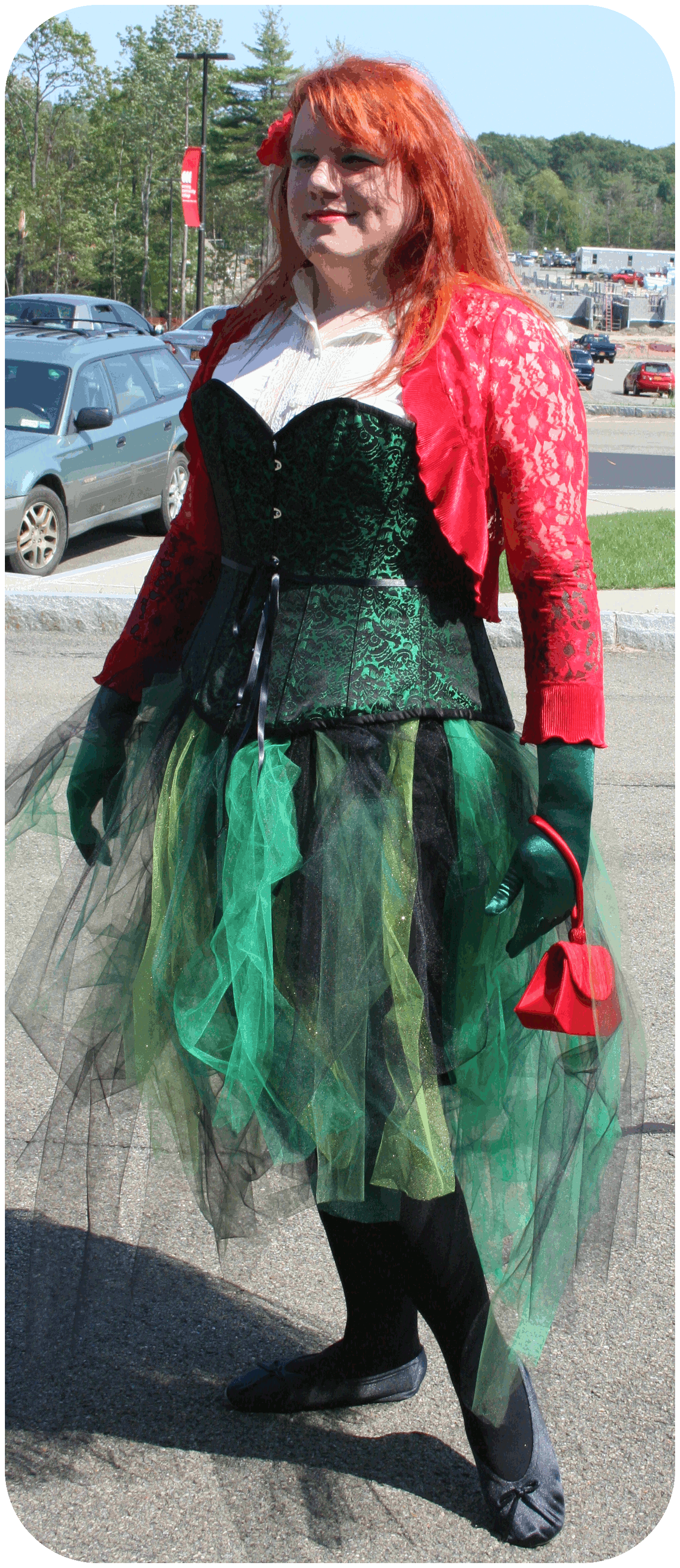 The rest of the costume consisted of: black tights, a creme blouse, a black and green corset, black skirt with tulle skirt over (which I made) and faux bustle-turned-apron in the back (which I also made), hunter green satin opera gloves, red purse, and a red jacket which came from a nightgown set. He neglected to wear the ivy sash I made, but did wear the ivy hair clips. I also made a red rose hair clip for Ms. Ivy.
