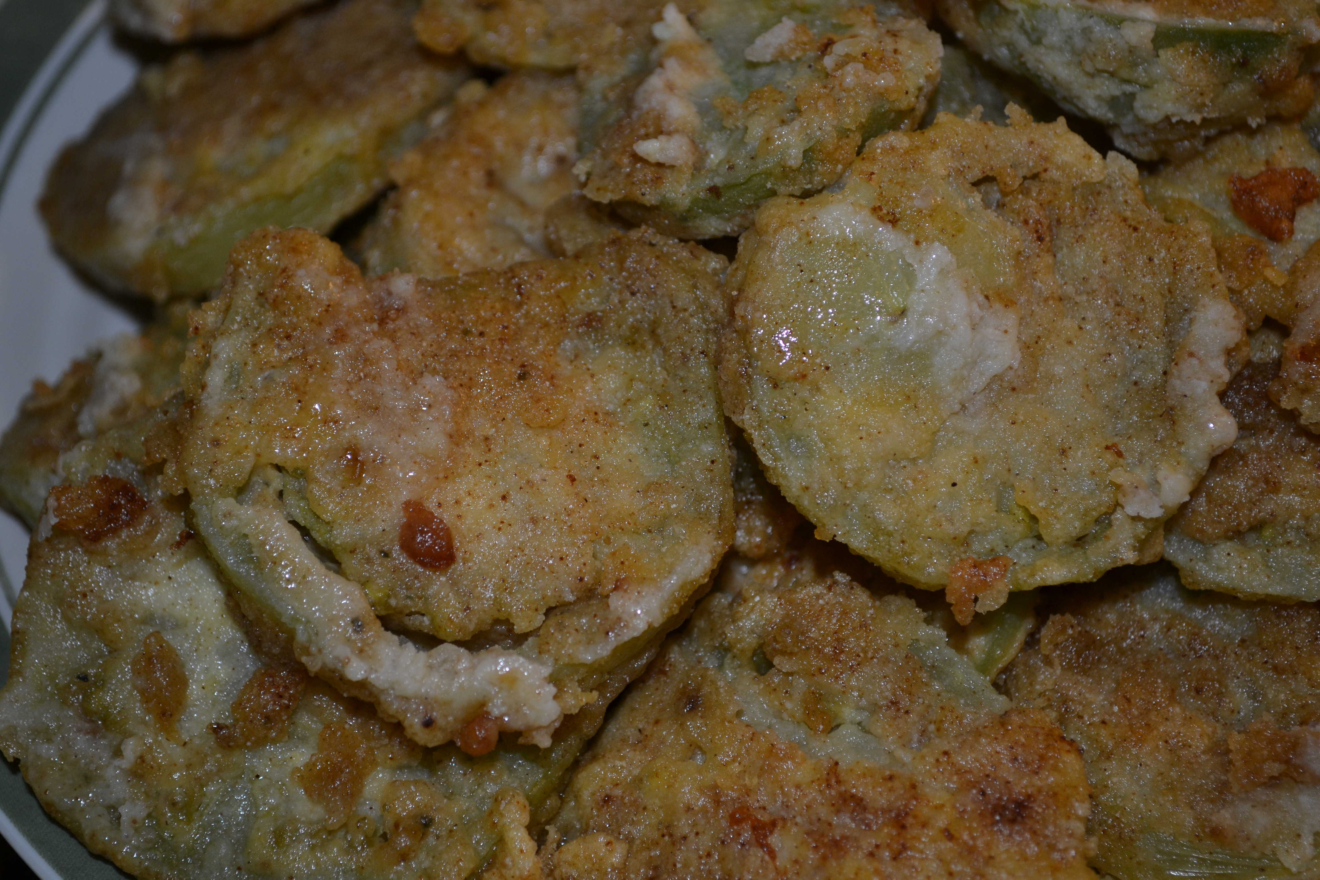 Heat up some oil. (I used safflower oil in a frying pan about an inch thick.) I fried around 9 slices at a time. If you are using a proper fryer, do a few at a time. Flip tomatoes over after a minute or so. Then, place the done fried tomatoes on a paper towel-covered plate to soak up the extra oil. Finish the rest of the batch doing the same. When done, put the tomatoes back on the cookie sheet and bake them at 350 degrees F for about 5 minutes. (This let me get the rest of my dinner on plates!)
