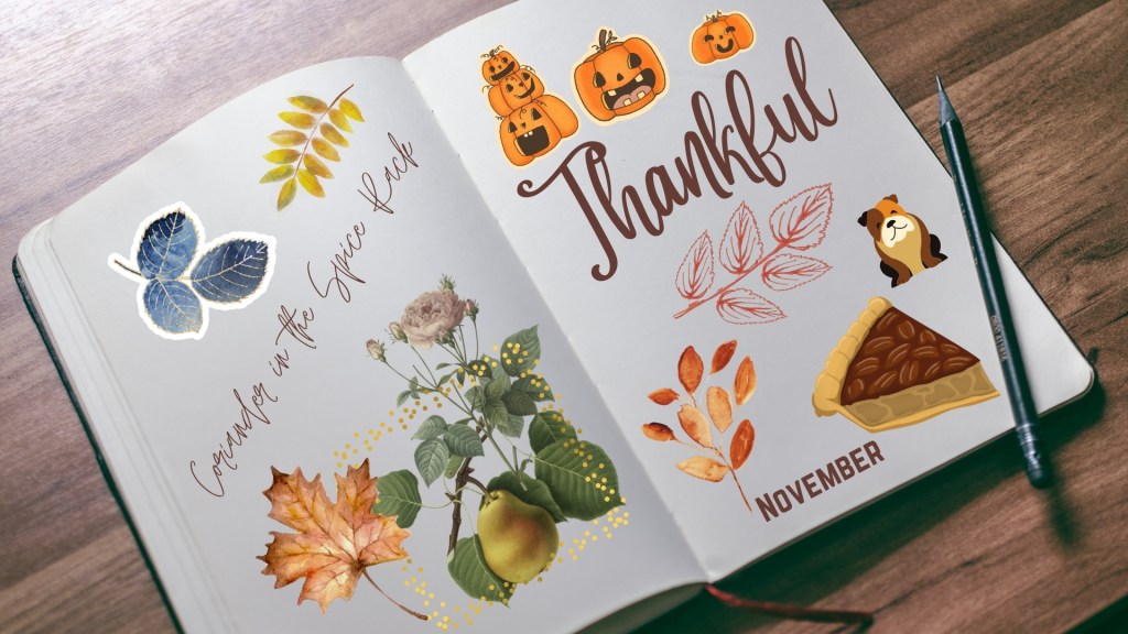 I have a daily gratitude practice, so November is extra thankfulness. I have collected journal books for years and years. I have only ever fully completed ONE journal though, and I just finished it! It’s one from Dollar Tree, which I collaged a lot of different magazine cutouts into, and it has a bunch of 2020 New Yorker Covid-19 pictures. Which is interesting to look back on now. I have my first “bullet” type journal, which I’ve been using as a weekly brain dump, and to collate various bits of things I need to remember.