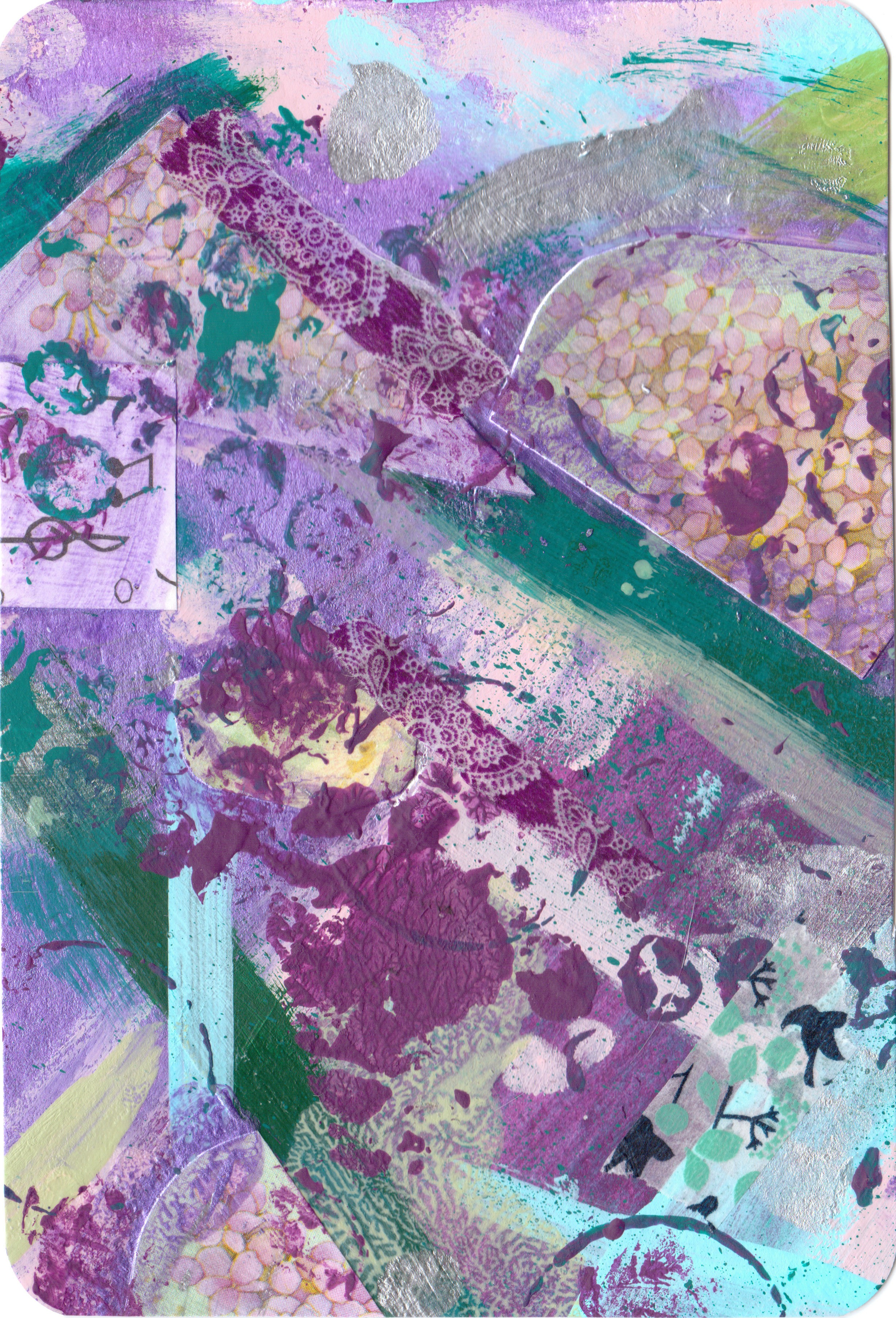 My last treasure thus far comes from Tina in Maryland. I love the snippets of words highlighted and the layers of blues. The orange sneaks in there, complementary. At the top of the piece are some dribbles of a glossy glue (maybe?) which adds a very interesting effect. It’s hard to see it on the scan, but it almost looks like rain.